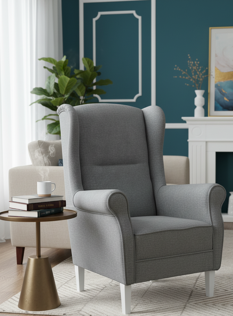 Fotel CHELSEA to klasyczny "uszak" z wygodnymi i szerokimi podłokietnikami. Wysokość oparcia oraz szerokość siedziska podkreślają wygodę podczas odpoczynku. Delikatny wciąg na oparciu podkreśla charakter mebla. Wygodne i szerokie podłokietniki pozwolą na odprężenie dla zmęczonych dłoni. Komfort odpoczynku zawdzięczamy połączeniu ze sobą dwóch typów sprężyn- falistej oraz bonellowej. Fotel idealnie wpasuje się w każdą przestrzeń. Proste drewniane nogi idealnie komponują się z całością fotela.