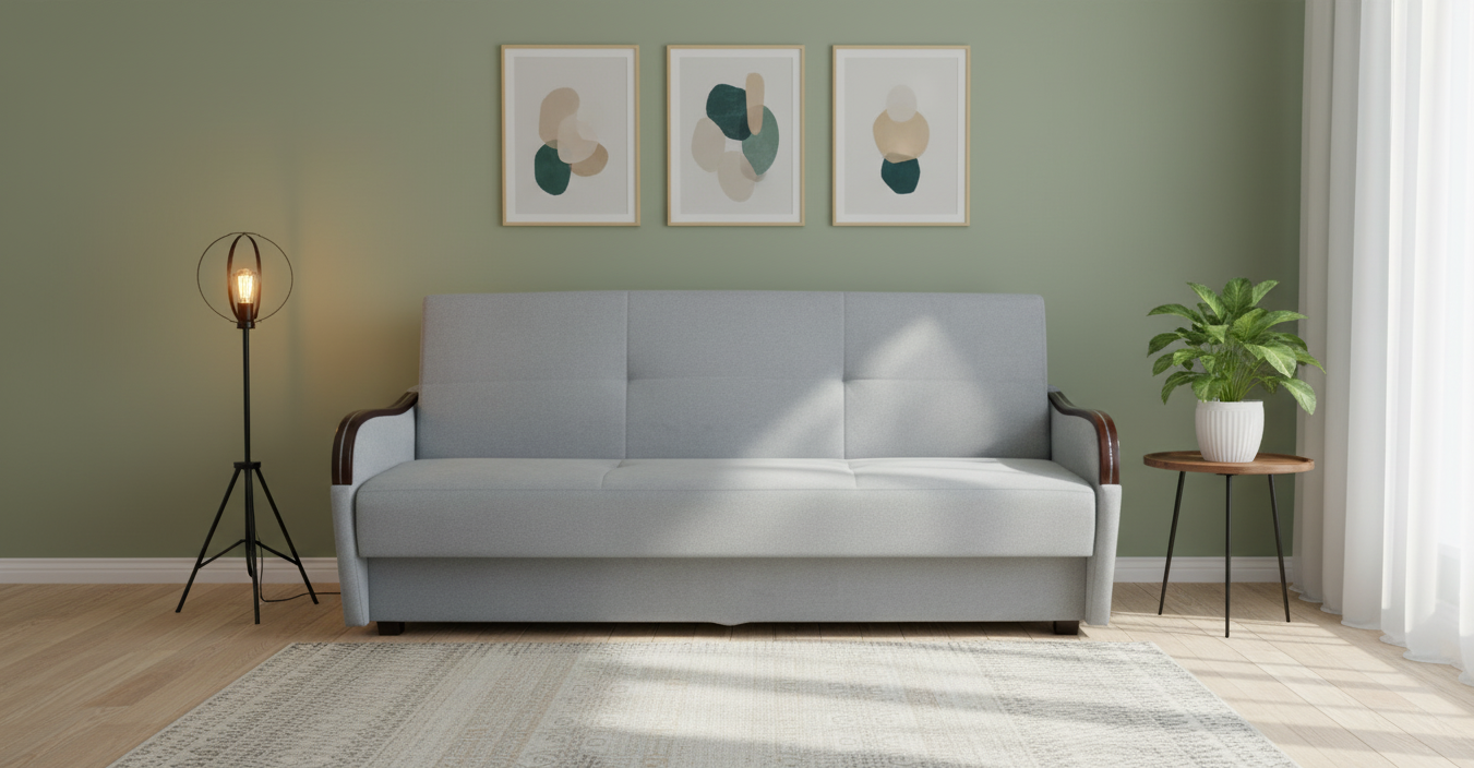 Wersalka rozkładana z drewnianymi dodatkami AXEL