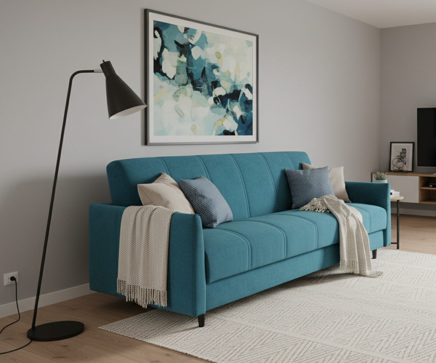 - Pojemnik na pościel: Przestronne miejsce do przechowywania, pomagające utrzymać porządek w salonie.